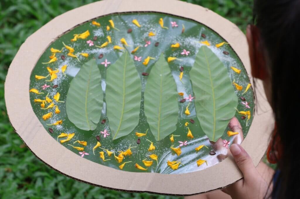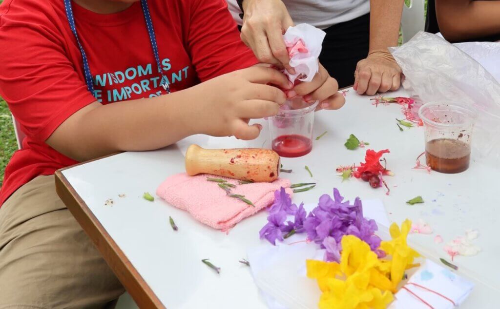 เด็ก ๆ ได้ใช้ประสาทสัมผัสผ่านการฟัง สำรวจ สังเกต สัมผัส ดมกลิ่น ลิ้มชิมรส เคลื่อนไหวร่างกาย การอยู่ร่วมกับธรรมชาติที่มีความปลอดภัย สร้างความสัมพันธ์และผูกพันที่ดีกับธรรมชาติ เด็ก ๆ สามารถเชื่อมโยงตัวเองกับธรรมชาติ ด้วยการวาดภาพ เขียนบันทึกธรรมชาติ ทำศิลปะจากธรรมชาติ การได้เดิน มอง ปีนป่าย วิ่ง เล่น หรือได้เล่นสนุกกับการสำรวจค้นหาสีสันจากธรรมชาติ เลือกสรรใบไม้ ดอกไม้ ใบหญ้า ดิน จากธรรมชาติมาสร้างสรรค์ผลงานศิลปะได้หลากหลายรูปแบบ การสกัดสีช่วยพัฒนากล้ามเนื้อมือในการหั่น ขยำ ตำ การนำสีธรรมชาติมาระบายสี นอกจากได้สีธรรมชาติที่สวยงามอ่อนหวาน เด็กยังได้กลิ่นหอมของสีธรรมชาติ เช่น ใบเตย ขมิ้น กุหลาบ ดาวเรือง ได้ลิ้มชิมรสของมะม่วงหาวมะนาวโห่ อัญชัน ได้ทดลองตัวกระตุ้นที่มีความเป็นกรดและด่าง มะนาว สารส้ม ที่ช่วยทำให้สีเข้มสีอ่อนแตกต่างกันไป การได้มองสีที่สวยงามจากธรรมชาติช่วยลดความเครียด เพิ่มความผ่อนคลายและสร้างความสงบ อ่อนโยน การใช้วัสดุธรรมชาติช่วยประหยัด ปลอดภัยต่อสุขภาพและโลก