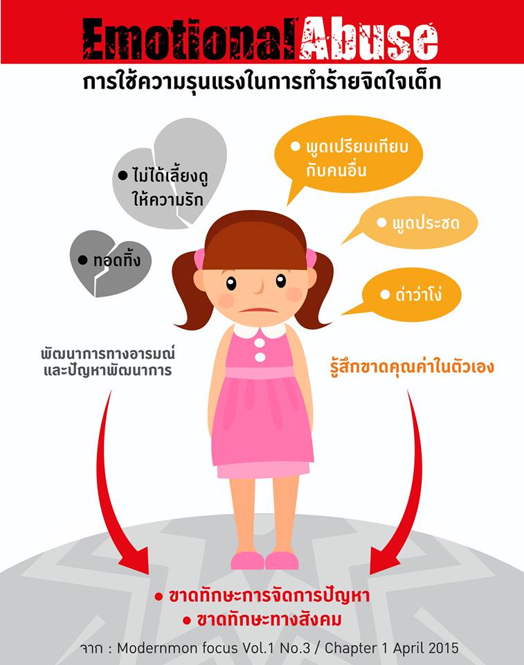 Emotional Abuse คือ การใช้ความรุนแรงในการทำร้ายจิตใจเด็ก เช่น การพูดประชดเด็ก การเอาเด็กไปเปรียบเทียบกับเด็กอื่น ซึ่งจริงๆ แล้วเราก็รู้ว่าเด็กแต่ละคนมีจุดดีจุดด้อย แต่เมื่อพ่อแม่เอาไปเปรียบเทียบกับลูกของคนอื่น ก็ต้องเปรียบเทียบในจุดด้อยของลูกตัวเองว่าด้อยกว่าเด็กอื่น ในบางด้านเมื่อเปรียบเทียบเช่นนี้ เด็กจะรู้สึกทันทีว่าตัวเอง “ไม่มีคุณค่า” “ไม่มีศักยภาพ” หรือ “เป็นคนอ่อนแอไร้ความสามารถ” เกิดความรู้สึกเกี่ยวกับตัวเองในทางลบ นี่ก็เป็นความรุนแรงที่สูงมาก มีผลกระทบต่อชีวิตเด็กสูงมาก หรือด่าว่าเด็กโง่ โดยไม่ดูสาเหตุว่าทำไมเด็กถึงทำไม่ได้…