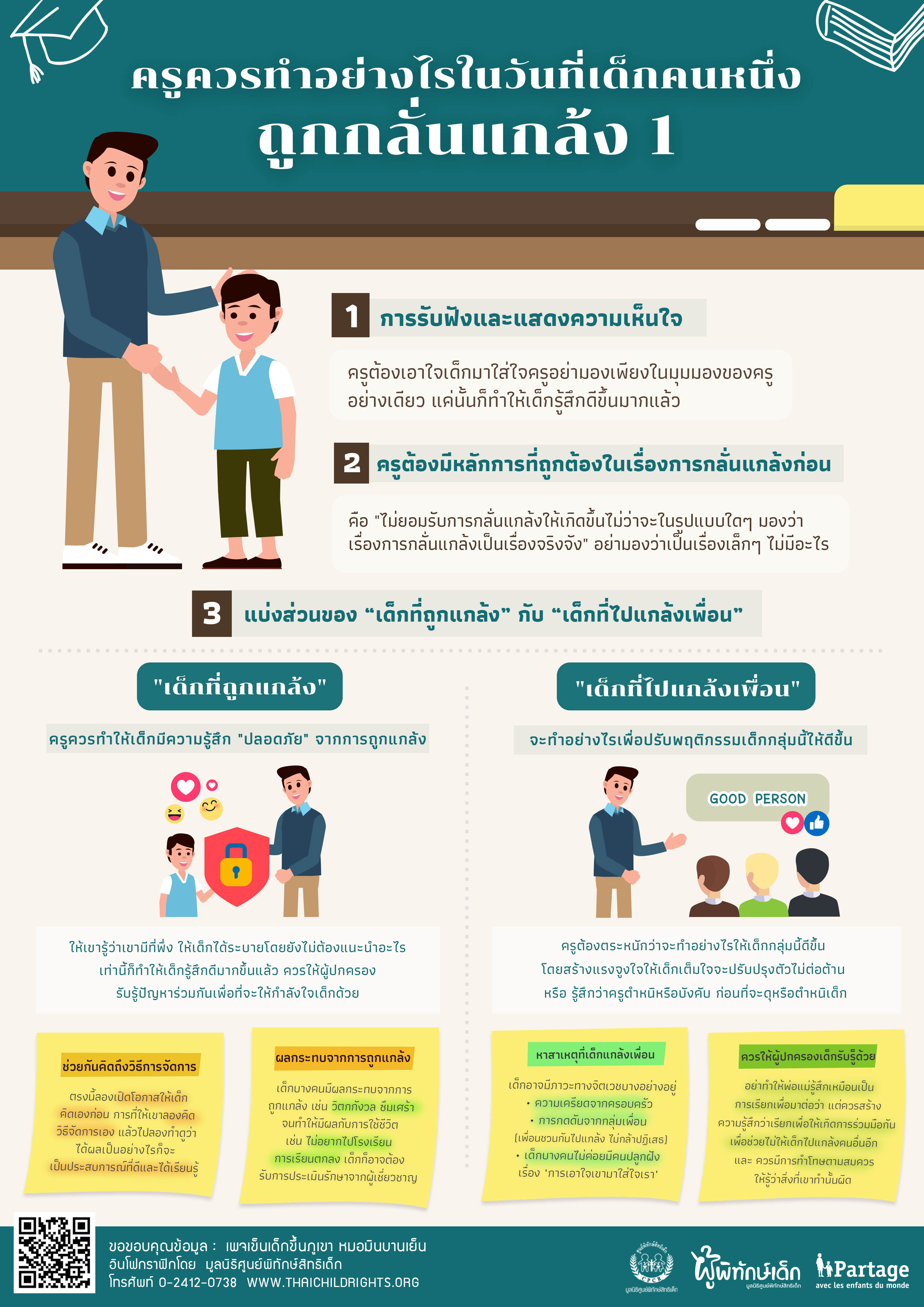 1) สิ่งที่ครูทำได้ทันทีก็คือ การรับฟังและแสดงความเห็นใจ โดยครูต้องเอาใจเด็กมาใส่ใจครู อย่ามองเพียงในมุมมองของครูอย่างเดียว ครูแสดงความเข้าใจและเห็นใจเด็ก แค่นั้นก็ทำให้เด็กรู้สึกดีขึ้นมากแล้ว
