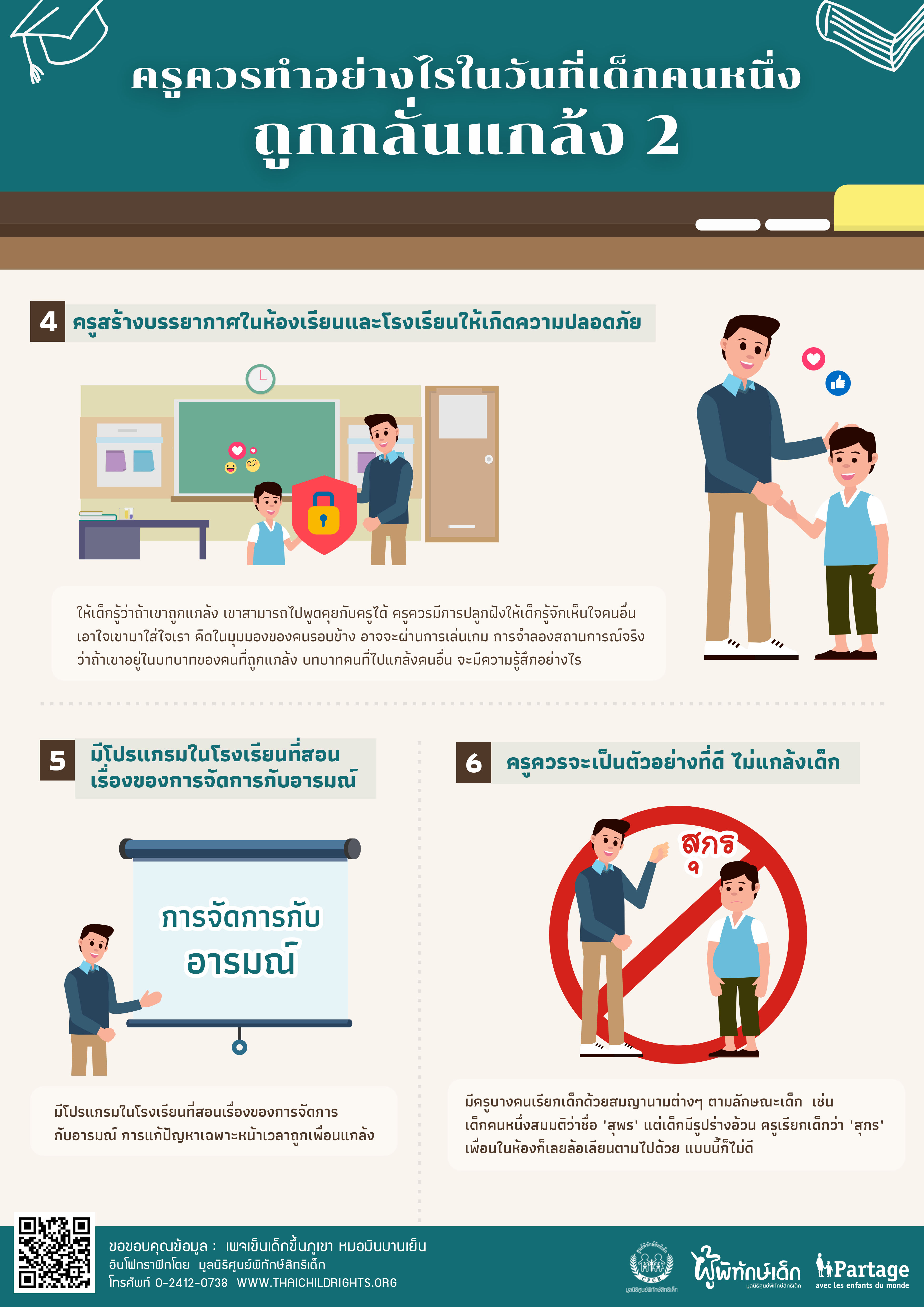 6) ครูควรจะเป็นตัวอย่างที่ดี ไม่แกล้งเด็ก หลายครั้งที่หมอได้ยินว่า มีครูบางคนเรียกเด็กด้วยสมญานามต่างๆ ตามลักษณะเด็ก (เช่น เด็กคนหนึ่งสมมติว่าชื่อ “สุพร” แต่เด็กมีรูปร่างอ้วน ครูเรียกเด็กว่า “สุกร”) เพื่อนในห้องก็เลยล้อเลียนตามไปด้วย แบบนี้ก็ไม่ดี