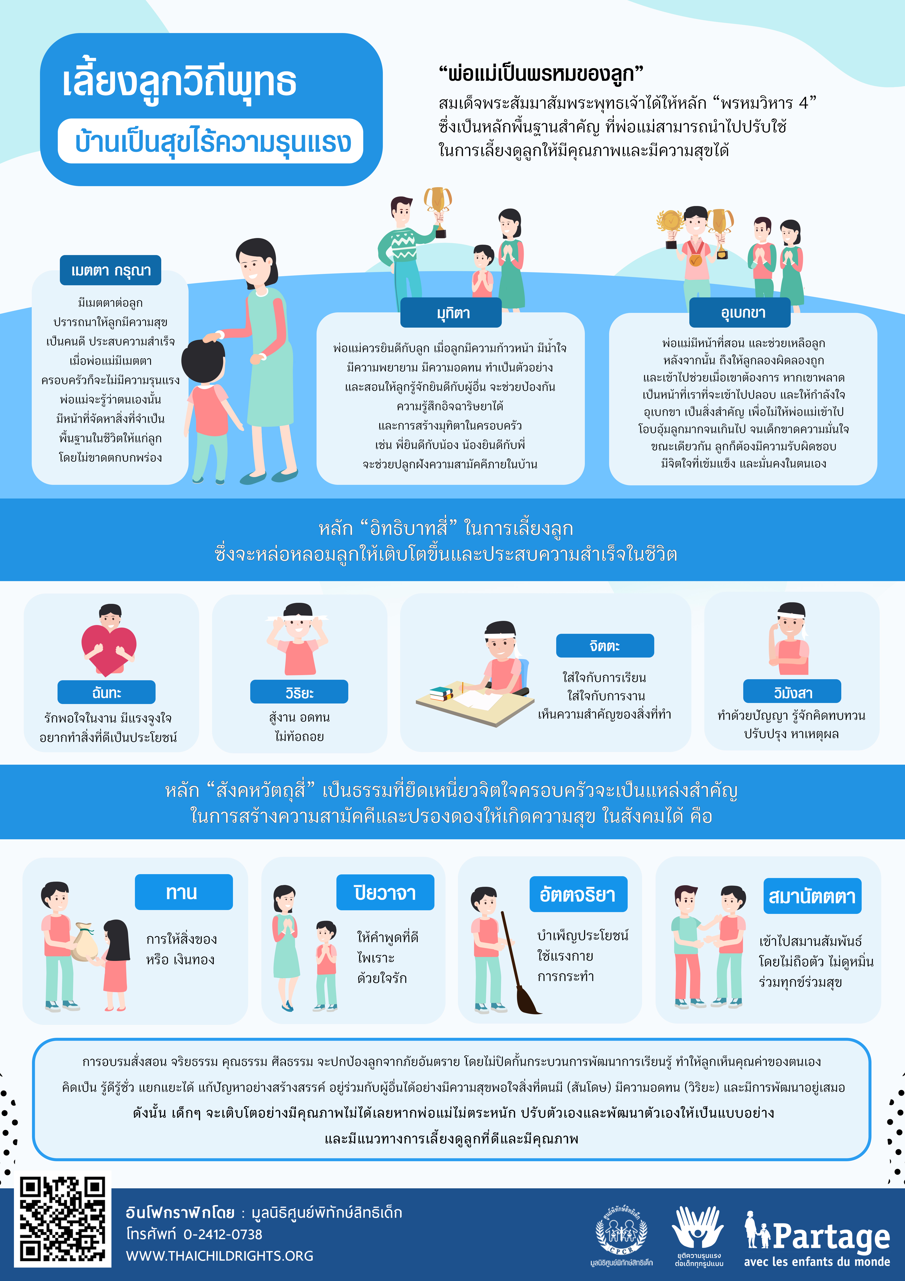 - เมตตา กรุณา การเลี้ยงดูลูกให้ดีและมีความสุขได้นั้น ต้องเริ่มต้นด้วยความเมตตาต่อลูก ปรารถนาให้ลูกมีความสุข เป็นคนดี ประสบความสำเร็จ และเกิดสิ่งดีๆกับลูกทุกอย่าง เพราะฉะนั้น หากพ่อแม่มีเมตตาเป็นพื้นฐาน พ่อแม่จะไม่ทำร้ายลูก และความรุนแรงในครอบครัวก็จะไม่เกิดขึ้น การทำร้ายการทารุณกรรมทั้งหลายจะไม่มีให้เห็นอย่างแน่นอน ด้วยความเมตตากรุณานี้เอง พ่อแม่ก็จะรู้ว่าตนเองมีหน้าที่จัดหาสิ่งที่จำเป็นพื้นฐานในชีวิตให้แก่ลูกโดยไม่ขาดตกบกพร่อง