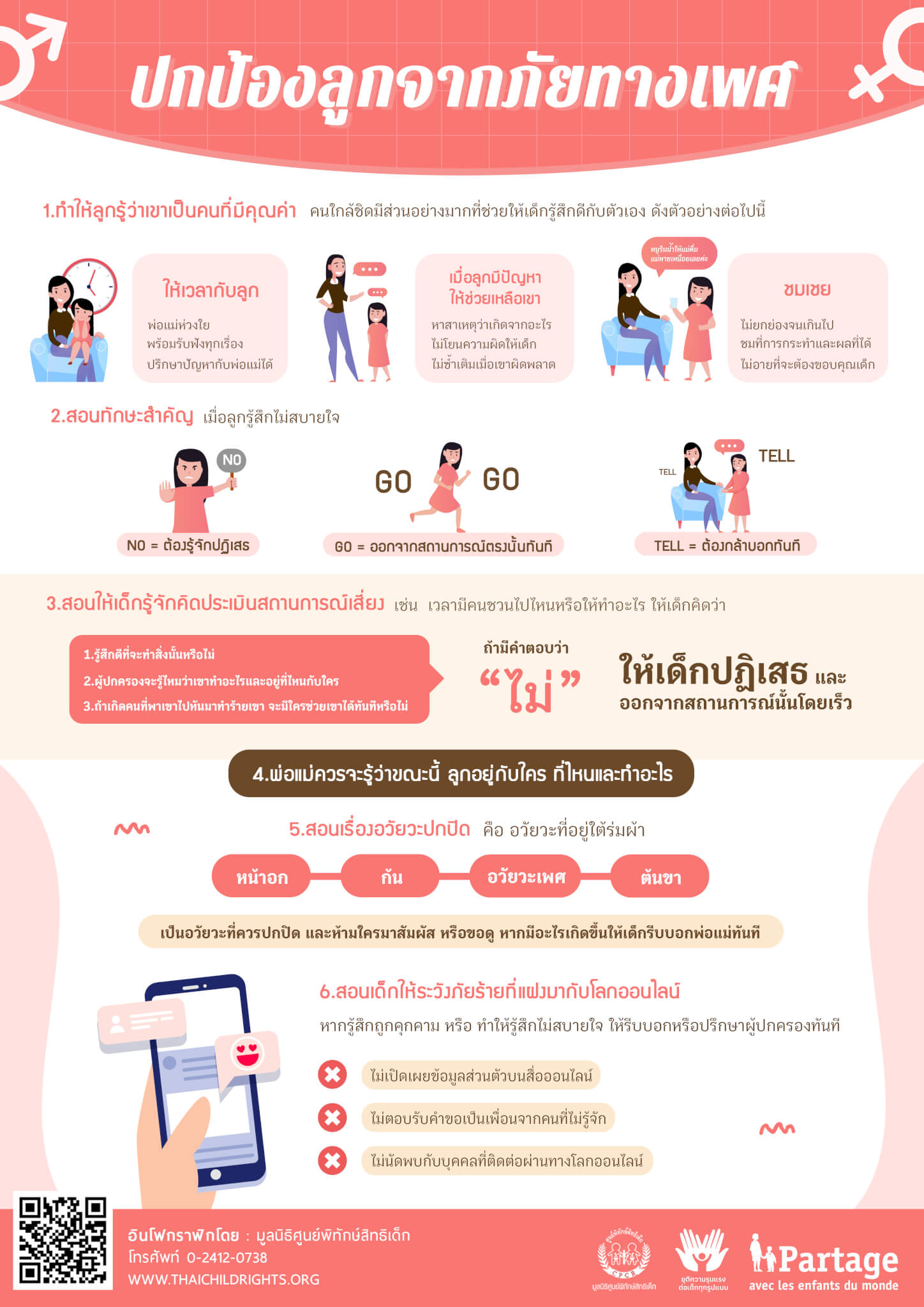 5.สอนเรื่องอวัยวะปกปิด คือ อวัยวะที่อยู่ใต้ร่มผ้า เช่น หน้าอก ก้น อวัยวะเพศ ต้นขา เป็นอวัยวะที่ควรปกปิดและห้ามใครมาสัมผัส หรือขอดู หากมีอะไรเกิดขึ้นให้เด็กรีบบอกพ่อแม่ทันที