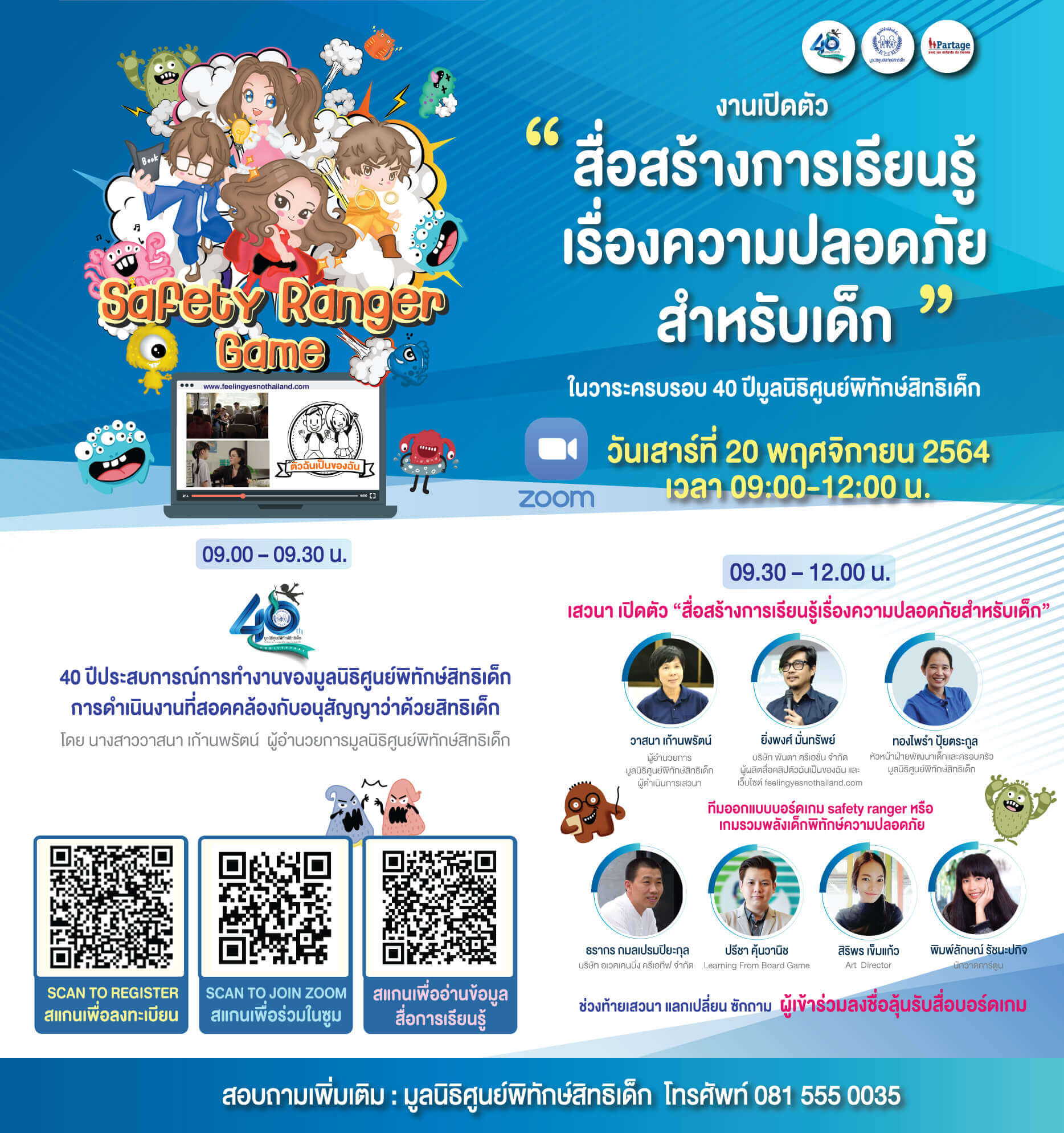 ในวาระครบรอบ 40 ปี มูลนิธิศูนย์พิทักษ์สิทธิเด็ก ขอเชิญร่วมฟังการเสวนาออนไลน์เปิดตัว "สื่อสร้างการเรียนรู้เรื่องความปลอดภัยสำหรับเด็ก"