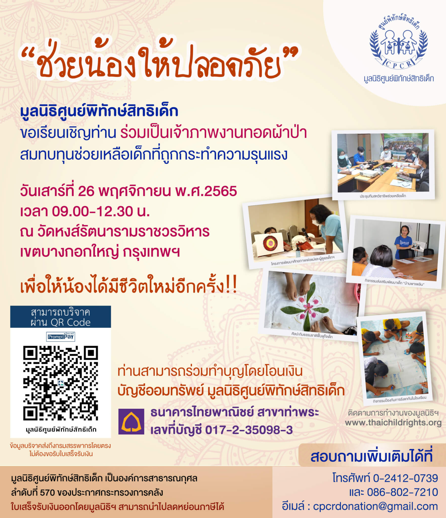 มูลนิธิศูนย์พิทักษ์สิทธิเด็ก ขอเรียนเชิญผู้มีจิตศรัทธาร่วมทำบุญทอดผ้าป่า “ช่วยน้องให้ปลอดภัย” สมทบทุนการดำเนินงานช่วยเหลือเด็กที่ถูกกระทำด้วยความรุนแรงในรูปแบบต่างๆ ในวันเสาร์ที่ 26