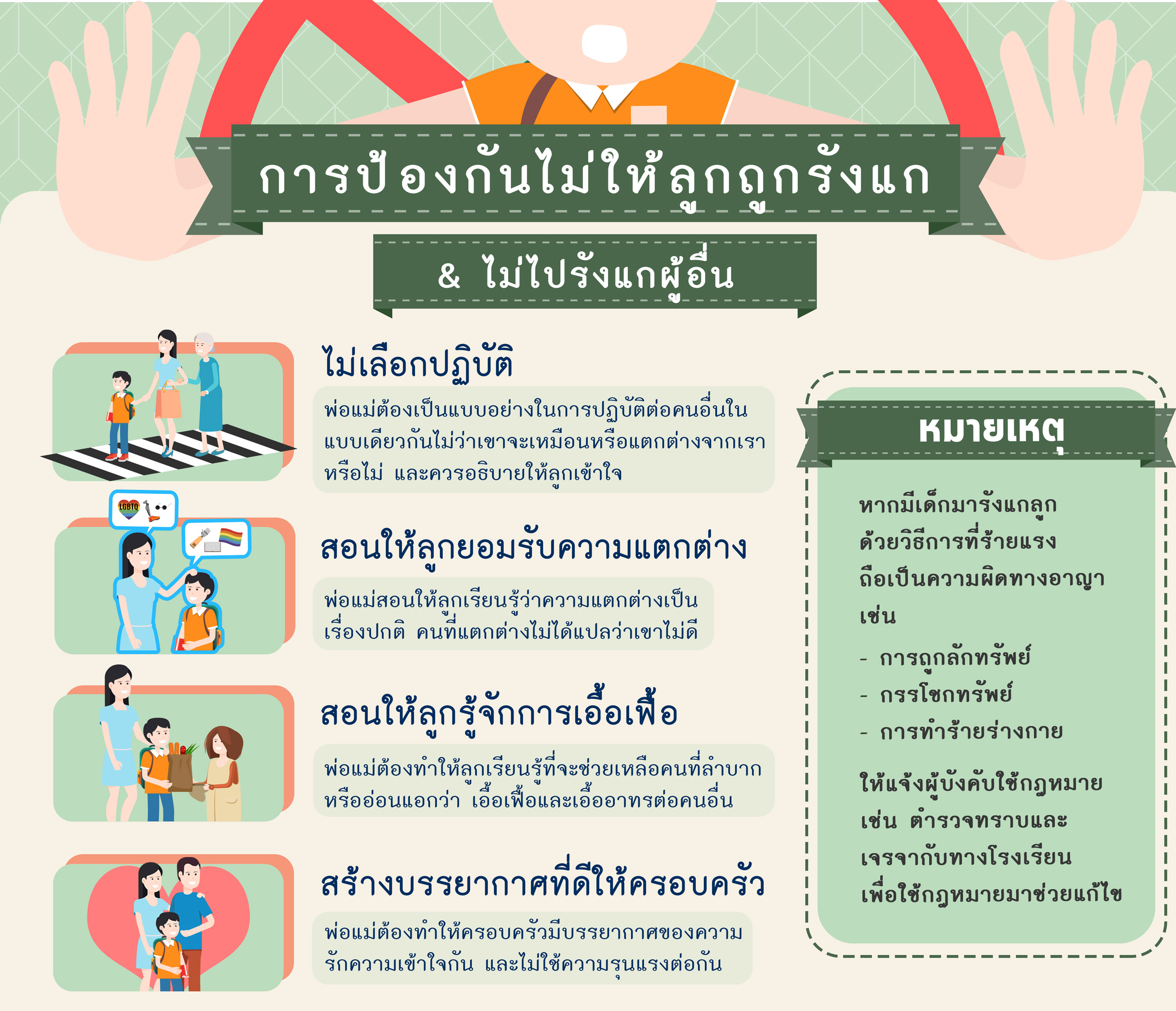พ่อแม่ผู้ปกครองจะป้องกันลูกของตนเองไม่ให้ถูกรังแก และลูกไม่ไปรังแกผู้อื่นได้อย่างไรบ้าง ติดตามรายละเอียดได้ในอินโฟกราฟิก เพื่อร่วมกันหยุดความรุนแรงต่อเด็กทุกรูปแบบ