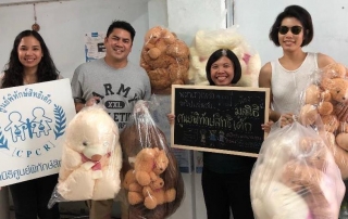 “พวกเราเหล่าหมี จะไปเล่นกับน้องๆ ที่ มูลนิธิศูนย์พิทักษ์สิทธิเด็ก….” ข้อความนี้เขียนด้วยลายมือน่ารักๆบนกระดานดำที่ตั้งไว้ใกล้ๆกับซุ้มตุ๊กตาหมีหลายสิบตัว ช่วยสร้างบรรยากาศให้งานแต่งงานของคู่บ่าวสาว มีความน่ารัก อบอุ่น อบอวลไปด้วยความสุขและมีความหมายมากยิ่งขึ้น คุณแป๋ม เจ้าสาวของงานเล่าให้ฉันฟังถึงที่มาของการจัดงานแต่งงานที่อบอุ่นด้วยเหล่าตุ๊กตาหมีว่า “ที่มีตุ๊กตาน้องหมีเพราะคุณทอม (เจ้าบ่าว) เป็นคนตัวใหญ่