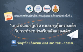 การแลกเปลี่ยนเรียนรู้โรงเรียนคุ้มครองเด็กออนไลน์ ครั้งที่ 2 หัวข้อ "บทเรียนของผู้บริหารและครูคุ้มครองเด็ก...กับการทำงานโรงเรียนคุ้มครองเด็ก” วันพุธที่ 11 สิงหาคม 2564 มูลนิธิศูนย์พิทักษ์สิทธิเด็ก ร่วมกับศูนย์เฉพาะกิจคุ้มครองและช่วยเหลือเด็กนักเรียน สพฐ. และเครือข่ายแกนนำโรงเรียนคุ้มครองเด็ก จัดให้มีการแลกเปลี่ยนเรียนรู้โรงเรียนคุ้มครองเด็กออนไลน์ครั้งที่ 2 เรื่อง "บทเรียนของผู้บริหารและครูคุ้มครองเด็กกับการทำงานโรงเรียนคุ้มครองเด็ก"