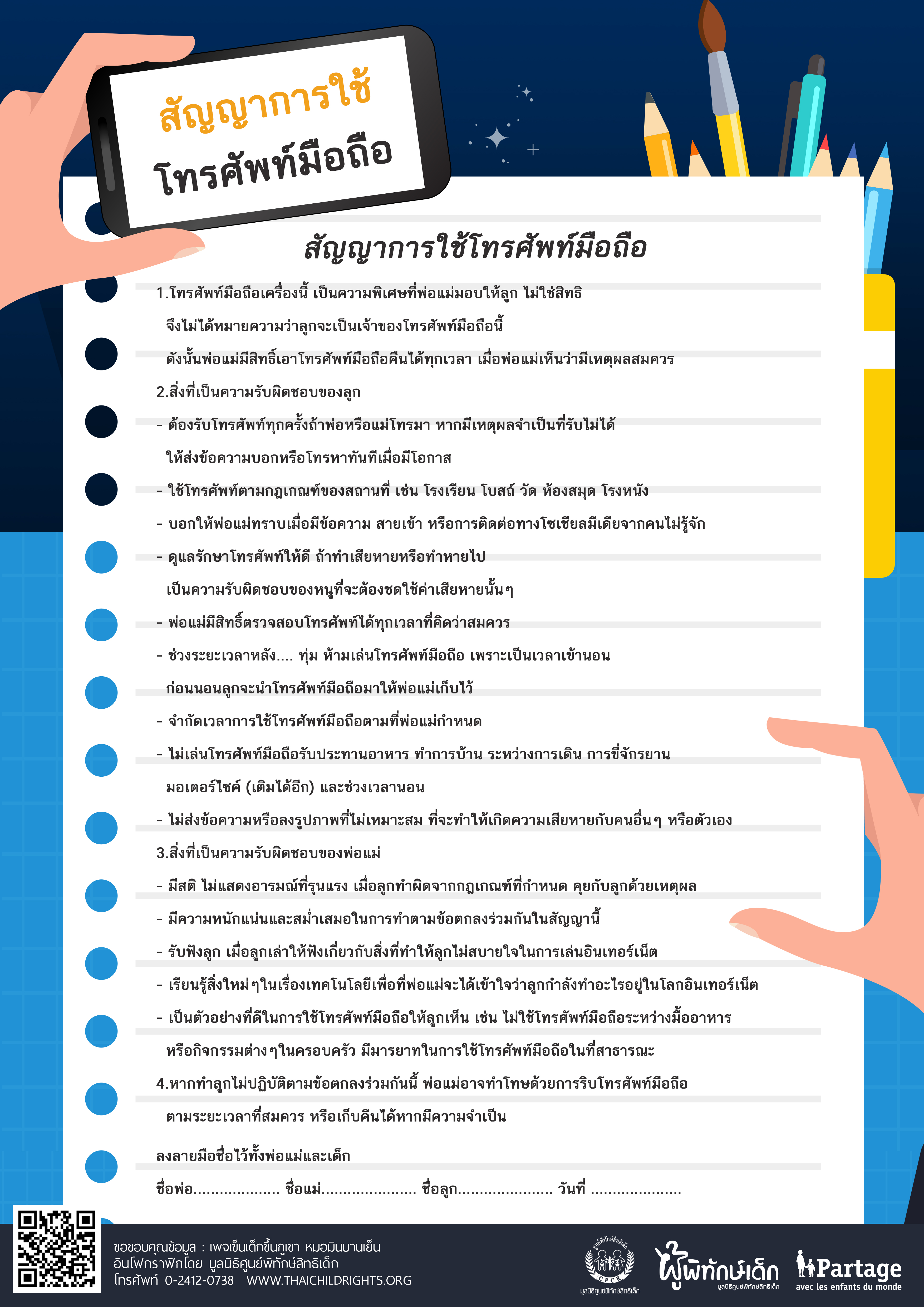 4.หากทำลูกไม่ปฏิบัติตามข้อตกลงร่วมกันนี้ พ่อแม่อาจทำโทษด้วยการริบโทรศัพท์มือถือตามระยะเวลาที่สมควร หรือเก็บคืนได้หากมีความจำเป็น