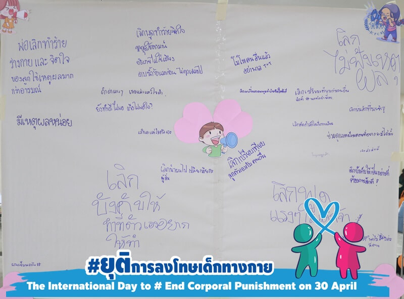 มีภาคีเครือข่ายผู้บริหารและครูโรงเรียนคุ้มครองเด็ก 4 ภาค ร่วมรณรงค์เปลี่ยนรูปโปรไฟล์ ใส่กรอบรูปยุติการลงโทษเด็กทางกาย ถ่ายรูปกับป้ายคำรณรงค์ และโพสต์ลงสื่อโซเชียล เพื่อแสดงพลัง และมีเสียงของเด็กจากแกนนำเด็กเยาวชน ตำบลท่าลาน อำเภอบ้านครัว จังหวัดสระบุรี ด้วยการส่งเสียงถึงผู้ใหญ่เป็นข้อความ บอกให้ผู้ใหญ่รับรู้ว่าพวกเขารู้สึกอย่างไร กับการลงโทษทางกายและความรุนแรงทุกรูปแบบ