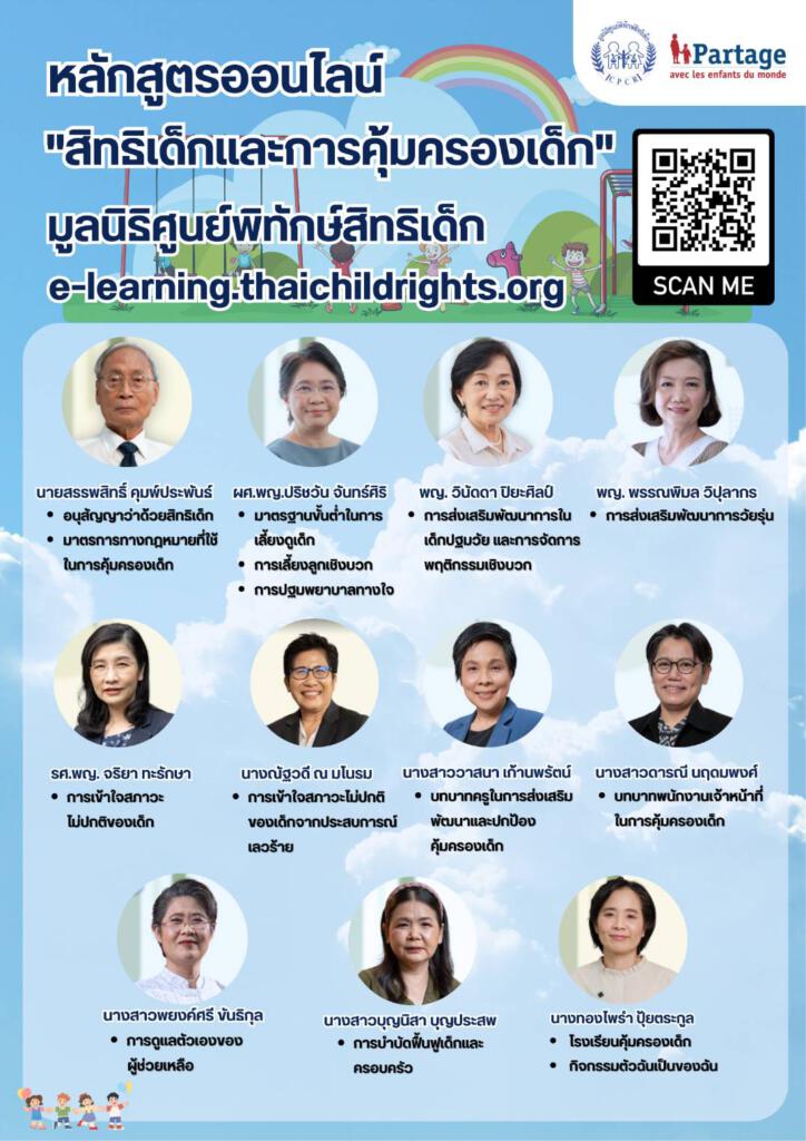 มูลนิธิศูนย์พิทักษ์สิทธิเด็ก จัดทำ หลักสูตร “สิทธิเด็กและการคุ้มครองเด็ก” ในรูปแบบบทเรียนอิเล็กทรอนิกส์ (E-learning) เพื่อให้พนักงานเจ้าหน้าที่คุ้มครองเด็ก ผู้มีหน้าที่คุ้มครองสวัสดิภาพเด็ก นักสังคมสงเคราะห์ ครู บุคลากรในกระบวนการยุติธรรม องค์กรพัฒนาเอกชน เจ้าหน้าที่และผู้ปฏิบัติงานที่ผู้เกี่ยวข้องและผู้สนใจ ได้เรียนผ่านระบบออนไลน์ เพื่อให้ผู้เข้าอบรมมีความรู้ความเข้าใจในเรื่องสิทธิเด็กและการคุ้มครองเด็ก การส่งเสริมให้บุคคลแวดล้อมเด็กมีความรู้ความเข้าใจจะทำให้เด็กปลอดภัย ได้รับการส่งเสริมพัฒนา และได้รับการช่วยเหลือคุ้มครองตามกระบวนการและเป็นไปตามกฎหมายที่เกี่ยวข้อง