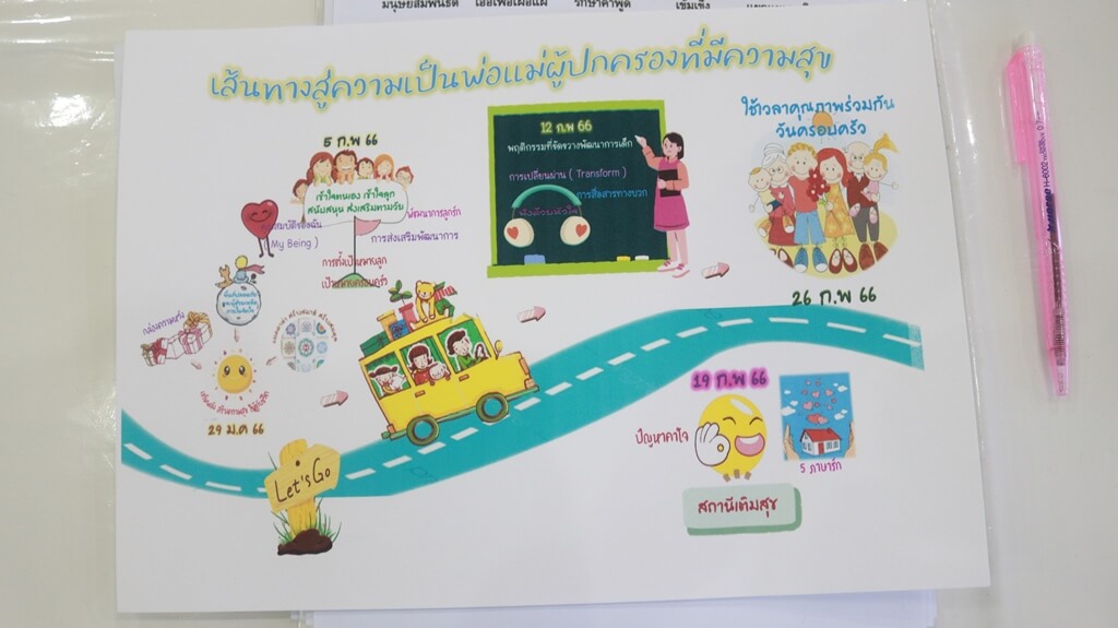 ครั้งที่ 2 กิจกรรมเติมความรู้และสร้างความเชื่อมั่นในศักยภาพแห่งตน ผ่านกิจกรรม ได้แก่ กิจกรรมเป้าหมายระยะยาวในการเลี้ยงลูก พัฒนาการเด็กวัย 13 – 18 ปี วิธีการสนับสนุนและส่งเสริมพัฒนาการ และ My Being