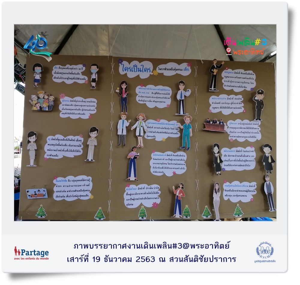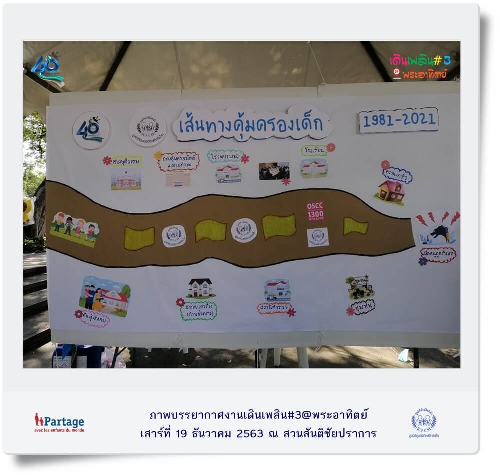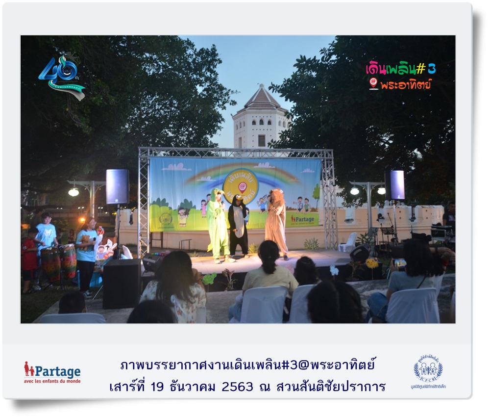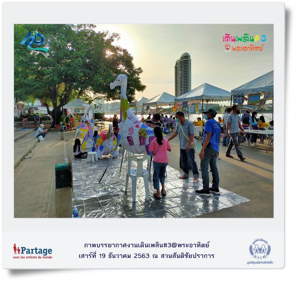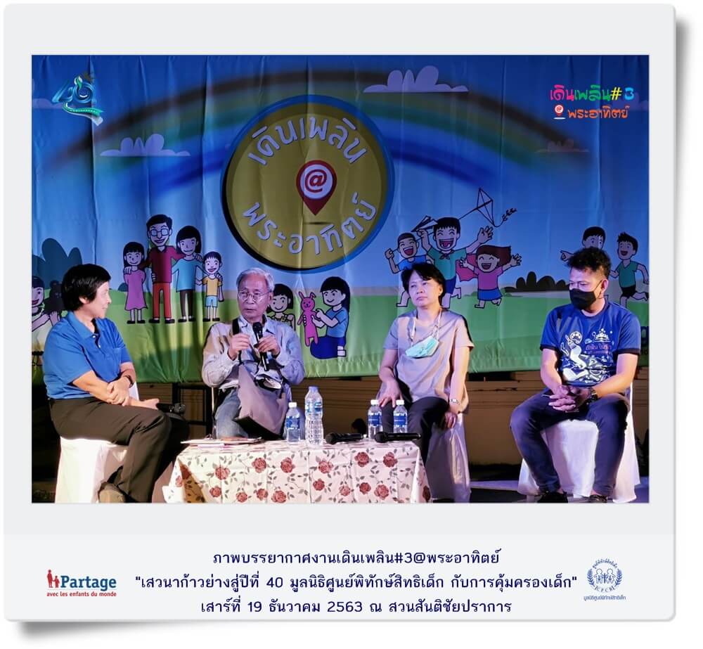 เมื่อวันเสาร์ที่ 19 ธันวาคม ที่ผ่านมา มูลนิธิศูนย์พิทักษ์สิทธิเด็ก จัดงานเดินเพลิน@พระอาทิตย์” ครั้งที่ 3 ณ สวนสันติชัยปราการ ภายในงานมีกิจกรรมสร้างสรรค์สำหรับเด็กและครอบครัวที่หลากหลายพร้อมสอดแทรกสาระที่เป็นประโยชน์ต่อการเลี้ยงดูเด็กอย่างมีความสุขไม่ใช้ความรุนแรง พร้อมนำเสนอนวัตกรรมการทำงานปกป้องคุ้มครองเด็กผ่านกิจกรรม อาทิ ช่วยน้องปลอดภัย ศิลปะบำบัด ตัวฉันเป็นของฉัน stop bullying ภัยร้ายใกล้ตัว หุ่นเชิดหรรษา หนังสือวิเศษ D.I.Y หน้ากากอนามัย ฯลฯ และในโอกาสที่ปี พ.ศ. 2564 มูลนิธิศูนย์พิทักษ์สิทธิเด็กดำเนินงานก้าวเข้าสู่ปีที่ 40 มูลนิธิฯ จึงจัดเสวนา หัวข้อ “ก้าวย่าง 40 ปีมูลนิธิศูนย์พิทักษ์สิทธิเด็กบนเส้นทางการคุ้มครองเด็ก” โดยมีนายสรรพสิทธิ์ คุมพ์ประพันธ์ ผู้ก่อตั้งและอดีตประธานมูลนิธิศูนย์พิทักษ์สิทธิเด็ก ผู้ชำนาญการประจำคณะกรรมการสิทธิมนุษยชนแห่งชาติ , พญ.ปริชวัน จันทรศิริ จิตแพทย์เด็กและวัยรุ่น โรงพยาบาลจุฬาลงกรณ์, นายผดุงเกียรติ สุขสำราญ กรรมการบริหาร บริษัท ดรีมไชโย จำกัด (โครงการหนังสือวิเศษเพื่อน้อง) เข้าร่วมเสวนา