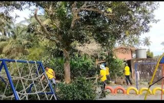 บางจุด ต้องใช้แรงงานผู้ชาย เช่น ต้นไม้ใหญ่ในสนามเด็กเล่นของเด็กอนุบาล ซึ่งครูบอกว่า เวลาเด็กมาเล่นบริเวณนี้เสี่ยงต่อกิ่งไม้หล่นใส่เด็ก…วันนี้ ผู้ใหญ่ใจดี ได้ปรับจุดเสี่ยงบริเวณนี้เรียบร้อยแล้ว