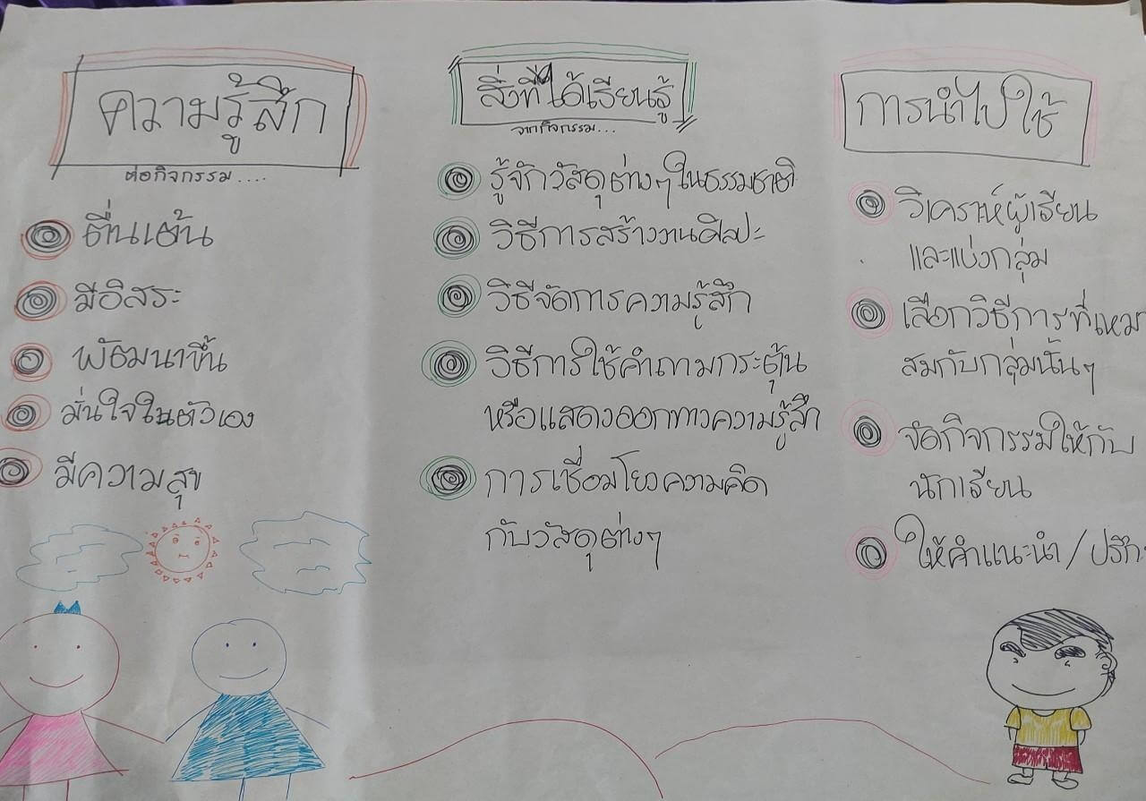 กิจกรรมนี้นอกจากจะสร้างสุขให้ครูแล้ว ยังทำให้ครูรู้ว่าธรรมชาติรอบตัวสามารถนำมาสร้างงานศิลปะได้ และช่วยสร้างสุขได้อย่างเรียบง่าย