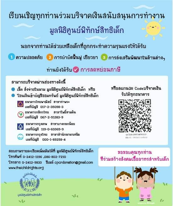 ในขณะที่เชื้อไวรัส COVID-19 แพร่ระบาดอย่างรุนแรง ปัญหาความรุนแรงต่อเด็กยังคงเกิดขึ้น และมีแนวโน้มจะสูงมากขึ้น มูลนิธิศูนย์พิทักษ์สิทธิเด็กจะพยายามช่วยเหลือคุ้มครองเด็กตามกระบวนการคุ้มครองเด็กอย่างเต็มที่ ในขณะที่ปัจจุบันมูลนิธิศูนย์พิทักษ์สิทธิเด็กได้รับการสนับสนุนการทำงานลดลงอย่างมากซึ่งเป็นผลกระทบจากการแพร่ระบาดของเชื้อไวรัส COVID-19 เช่นกัน เมื่อคนไม่มีงานย่อมไม่มีกำลังมาสนับสนุนการทำงานของมูลนิธิฯ ผู้บริจาคที่เคยสนับสนุนมูลนิธิฯ ทุกเดือนมาหลายปีมีหนังสือแจ้งขอลดจำนวนเงินบริจาค ดังนั้นขอเชิญทุกท่านที่ต้องการมีส่วนร่วมในการช่วยเหลือคุ้มครองเด็กถูกกระทำความรุนแรงบริจาคเงินสนับสนุนการทำงานของมูลนิธิศูนย์พิทักษ์สิทธิเด็ก เพื่อทำงานช่วยเหลือคุ้มครองเด็กที่ถูกกระทำความรุนแรงให้ได้รับความปลอดภัยและมีคุณภาพชีวิตที่ดีขึ้น