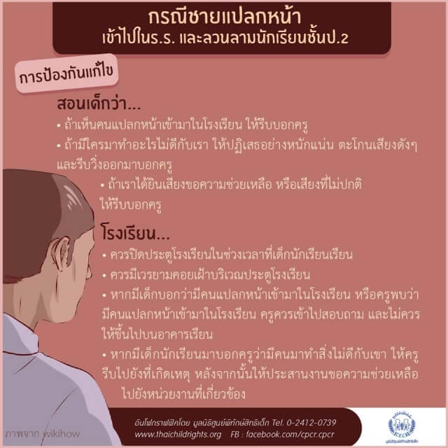• หากมีเด็กบอกว่ามีคนแปลกหน้าเข้ามาในโรงเรียน หรือครูพบว่ามีคนแปลกหน้าเข้ามาในโรงเรียน ครูควรเข้าไปสอบถาม และไม่ควรให้ขึ้นไปบนอาคารเรียน